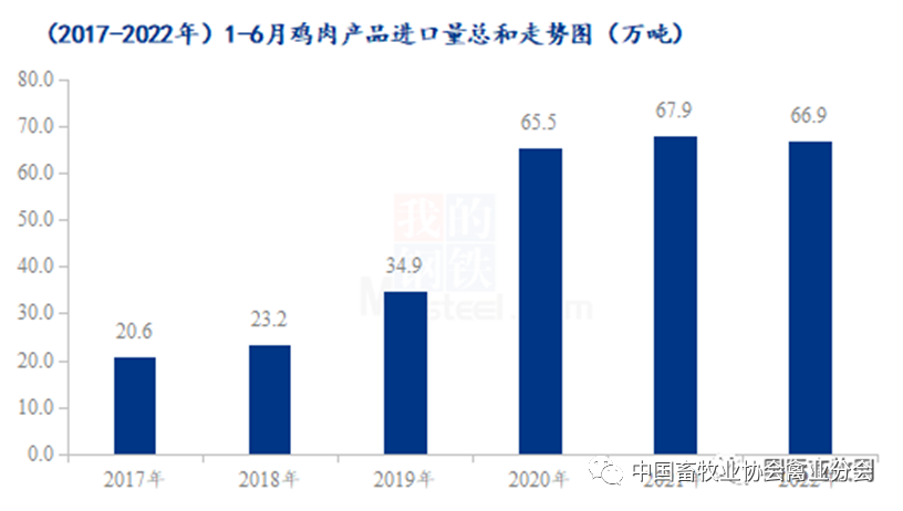 值得注意的是,雖然今年上半年全球受禽流感肆虐的影響和冷鏈端新冠疫情的持續干擾,前幾個月的進口量相較去年同期減量月份居多,但是2022年上半年的進口量由于6月份的強勢提振,總量達到了66.9萬噸,同比2021年僅下跌1萬噸。下半年進口量或仍有反轉增量機會。