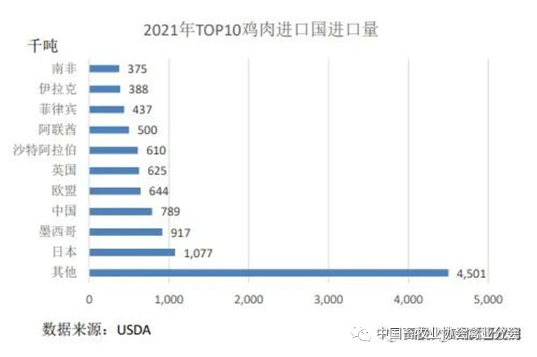 2021年全球雞肉主要進口地區有:日本、墨西哥、中國、歐盟等地區。2021年日本進口雞肉107.7萬噸,墨西哥進口雞肉91.7萬噸,中國進口雞肉78.9萬噸,歐盟進口肉雞64.4萬噸。分別占比全球總進口量的10%、8%、7%和6%,合計占比31%。