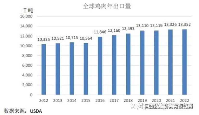 全球雞肉出口量呈現緩慢增長態勢,2021年雞肉出口量1332.6萬噸,占全球雞肉總產量的13%左右。