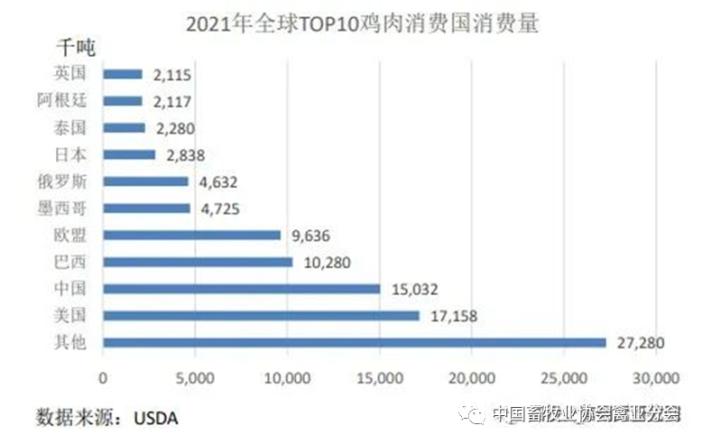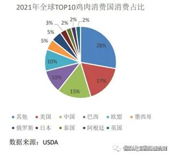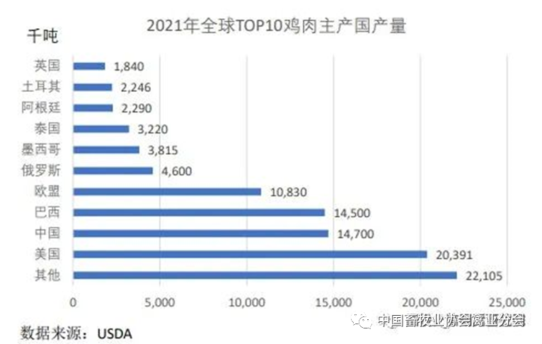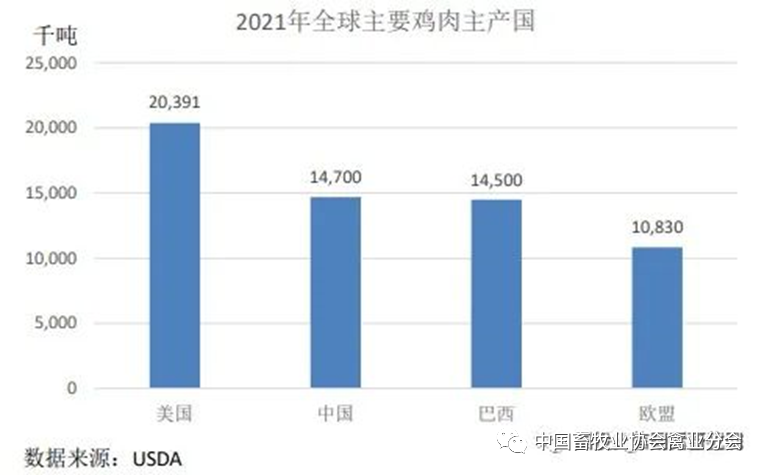 美國為第一大雞肉生產國,2021年雞肉產量占全球總產量的20%。中國雞肉產量占全球的15%,位居第二。巴西雞肉產量占全球的14%,歐盟雞肉產量占全球的11%。