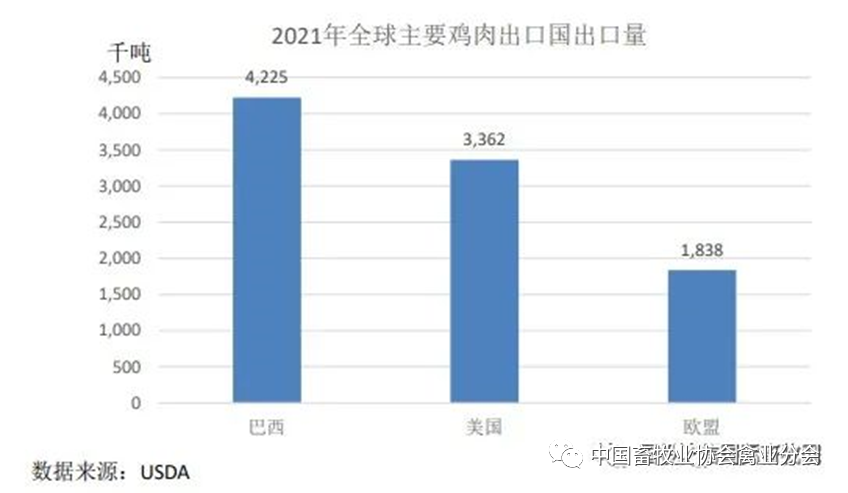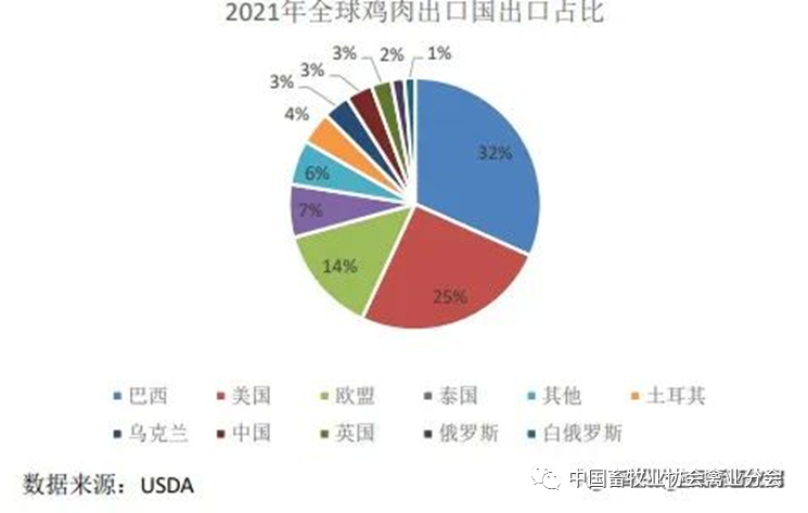 從雞肉主要出口國占比來看,雞肉出口較為集中,巴西、美國、歐盟是全球三大主要出口國,2021年這三個國家出口分別占全球總出口量的32%、25%和14%,合計占比71%。