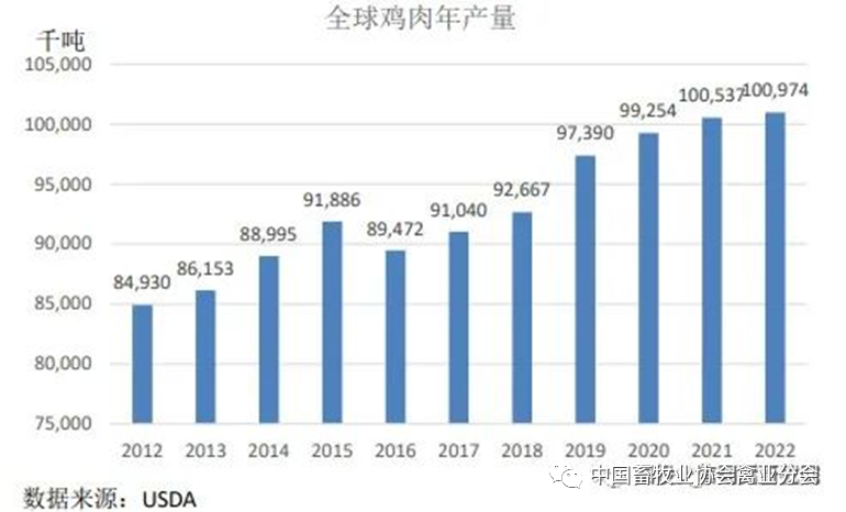 根據美國農業部數據,2021年全球雞肉產量為1.0054億噸,預計2022年全球雞肉產量繼續小幅增長。
