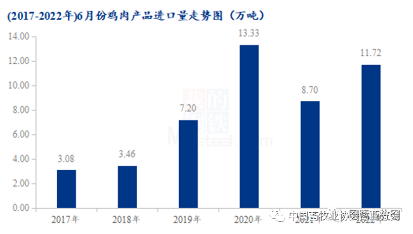 據海關總署數據統計,2022年6月份雞肉產品進口量達11.72萬噸,環比漲幅9.74%,同比漲幅34.67%。